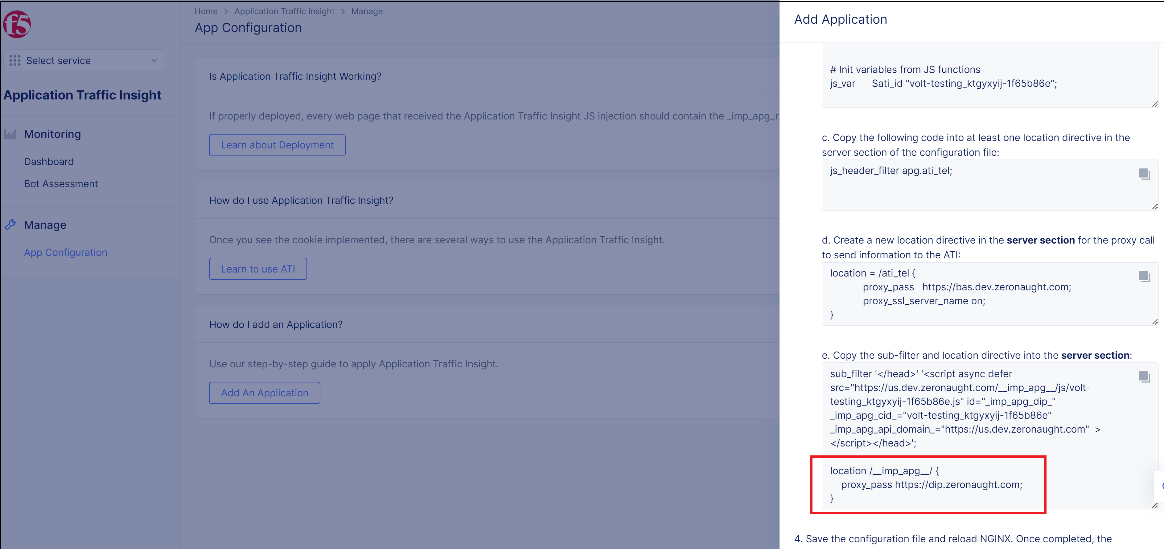 To inject the ATI JS in specific web pages only: If the application path is already defined as a location directive, copy the script tag to the relevant location.